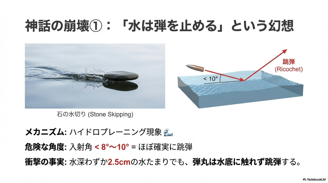 「水は弾を止める」という認識は弾道学的に誤りです。入射角が約8度〜10度未満の場合、水面はコンクリートと同様に弾丸を跳ね返します(ハイドロプレーニング現象)。特に水深が2.5cm程度の浅い水たまりであっても、弾丸は水底に触れることなく跳弾することが確認されています。