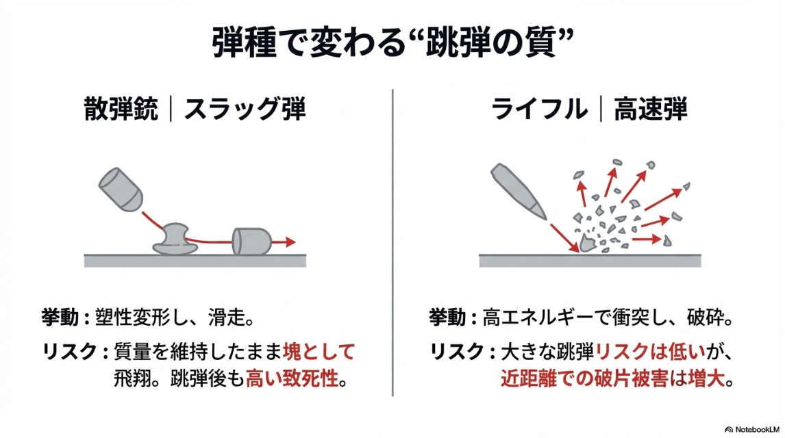 - 散弾銃(スラッグ弾): 質量が大きく、硬質面に当たっても粉砕せずに変形して滑走する傾向があります。大きな塊として残るため、跳弾後も高い致死性を維持します。