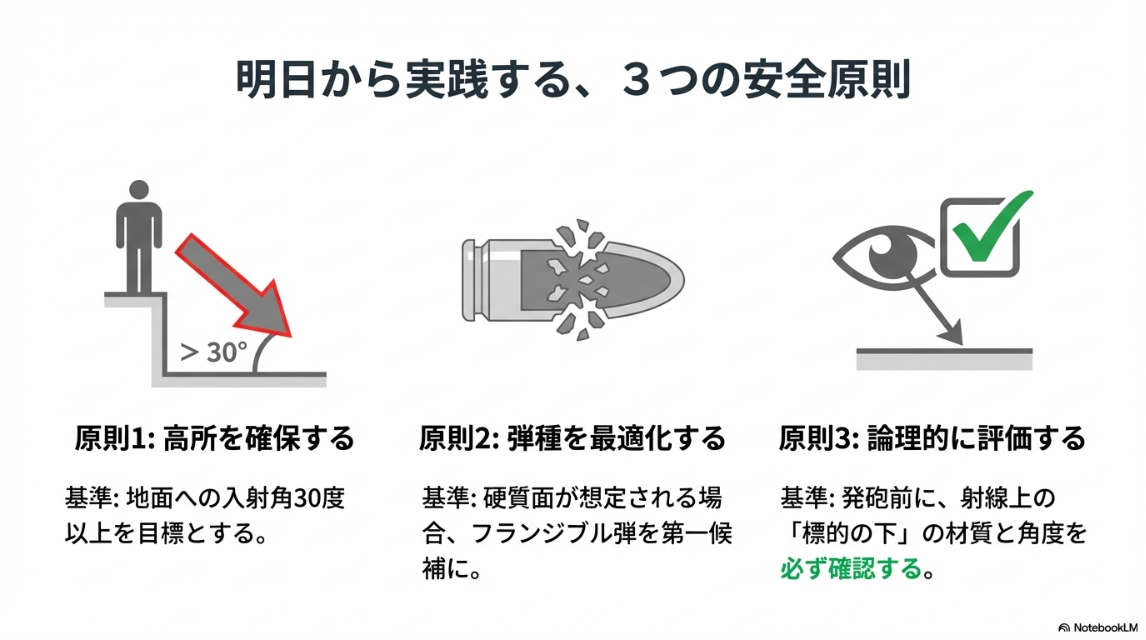 - 厳格な安全確認プロセス: 射線上の材質と角度を、発砲前に論理的に評価する。